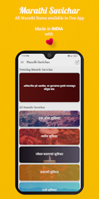 Marathi Suvichar เป็นแอปพลิเคชันที่ครอบคลุมและดีที่สุดสำหรับการแบ่งปัน คัดลอก และเก็บรักษา Marathi Suvichar, shayari, และคำคมล่าสุด แอปพลิเคชันนี้มีอินเตอร์เฟซที่ใช้งานง่าย ทำให้ใช้งานได้สะดวกสบายทั้งแบบออฟไลน์และออนไลน์ คุณสามารถใช้แอปพลิเคชันนี้เพื่อแบ่งปันสถานะที่คุณชื่นชอบกับเพื่อนและครอบครัวของคุณบน WhatsApp, Facebook และโซเชียลมีเดียอื่น ๆ คุณสามารถคัดลอก Marathi Suvichar ล่าสุดและวางไว้ในสถานะ WhatsApp หรือ Facebook ของคุณได้ คุณยังสามารถดาวน์โหลด Marathi Suvichar ล่าสุดในรูปแบบไฟล์ PDF เพื่อให้คุณสามารถบันทึกไว้ในอุปกรณ์ของคุณได้